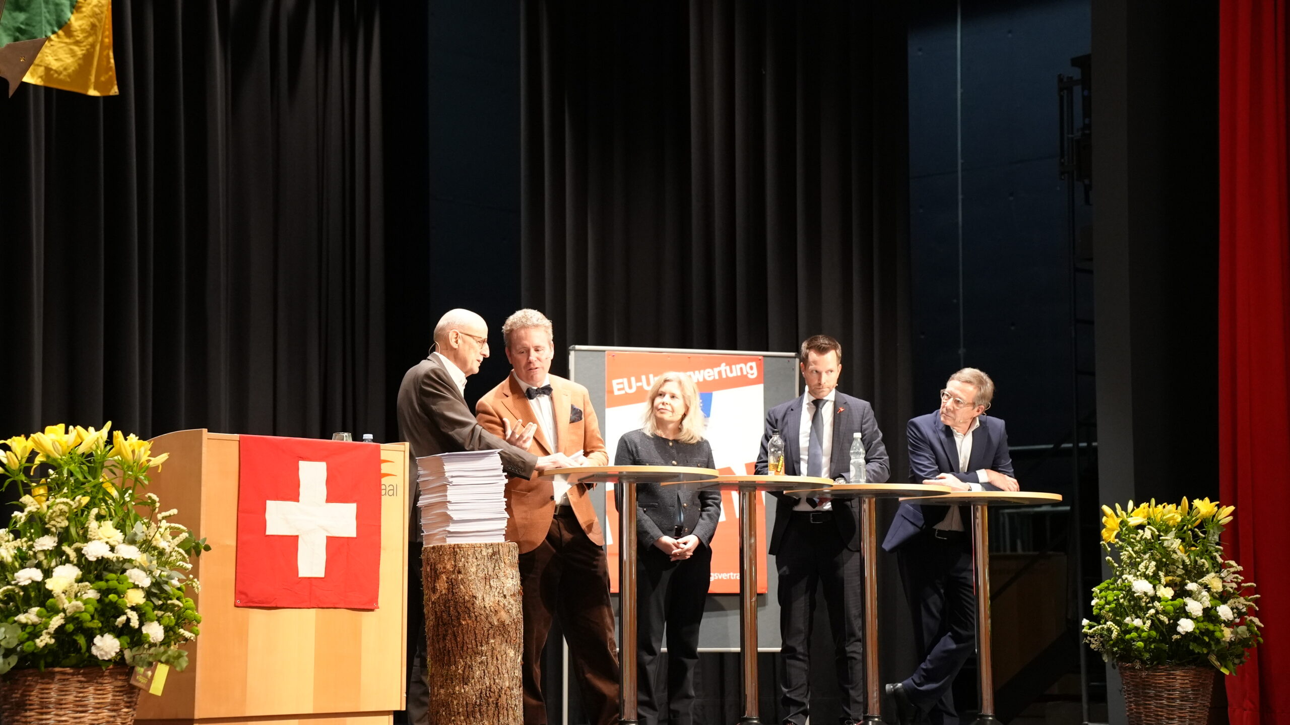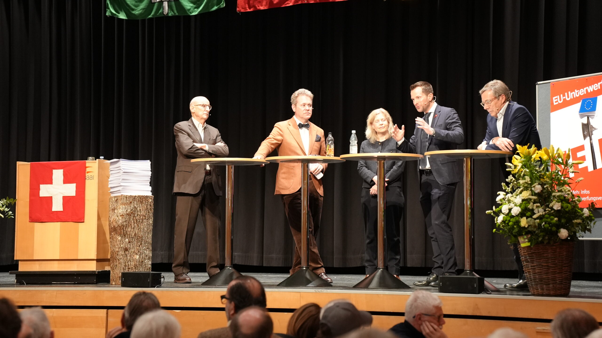 Unter der Leitung von Dominik Feusi diskutierten Prof. em. Dr. Giorgio Behr, Ständerätin Esther Friedli, Nationalrat Pascal Schmid und Dr. Kurt Weigelt aus verschiedenen Blickwinkeln die Auswirkungen der Verträge auf die Schweiz und deren Wirtschaft und Gewerbe. Professor Behr befürchtet eine Flut neuer Auflagen und zunehmende Bürokratie. Er betrachtet einen Abschluss als unnötig und ist überzeugt, dass sich die Schweizer Wirtschaft ohne die Verträge besser behaupten kann als mit. Für Ständerätin Esther Friedli bedeuten die jährlichen Milliardenzahlungen an die marode EU eine immense, zusätzliche Belastung für die Schweizer Steuerzahler und die Einwanderung in Sozialwerke würden zusätzliche Belastung bringen.