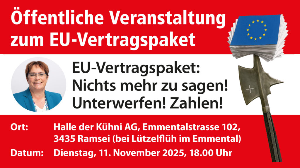 Mit dem EU-Vertrag verpflichtet sich die Schweiz zu regelmässigen Zahlungen an die hochverschuldete EU. Konkret sollen jährlich rund 1,4 Milliarden Franken direkt an Brüssel fliessen – bereits jetzt ist absehbar, dass dieser Betrag künftig steigen wird. Hinzu kommen Hunderte von Millionen Franken an indirekten Kosten, die in der Schweiz durch die Übernahme der EU-Bürokratie und der Umsetzung Tausender Seiten EU-Gesetze, EU-Richtlinien und EU-Verordnungen entstehen.